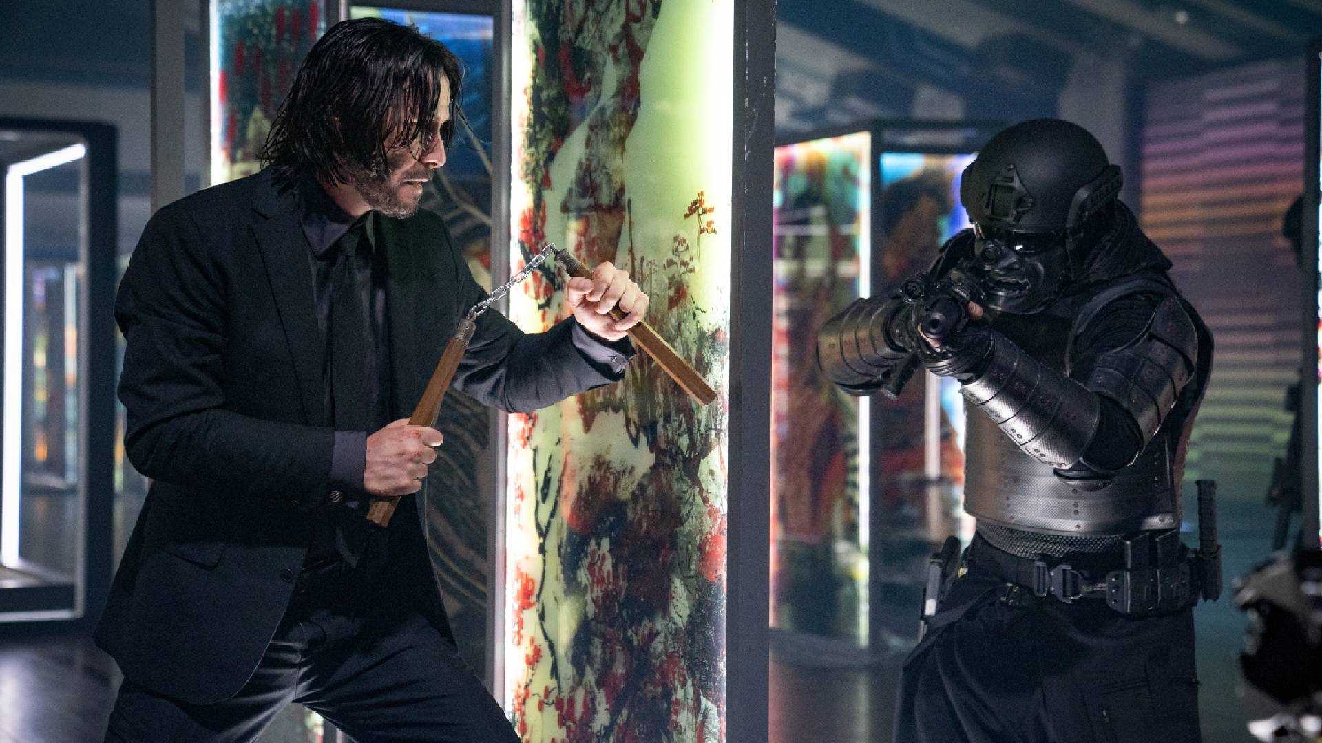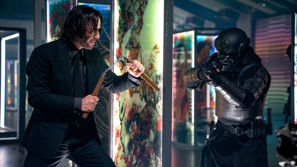 Конечно, эстетика оружия никуда не пропала, и герои всё так же пользуются огнестрелом, но ассортимент стал ещё шире. Появились уже упомянутые нунчаки, а ещё катаны, луки, сюрикены и даже ракетница. При этом мистер Уик по заветам Джеки Чана всё равно нет-нет, да использует что-то из подручных средств вроде игральной карты или легендарного карандаша. Так и до мебели недалеко.